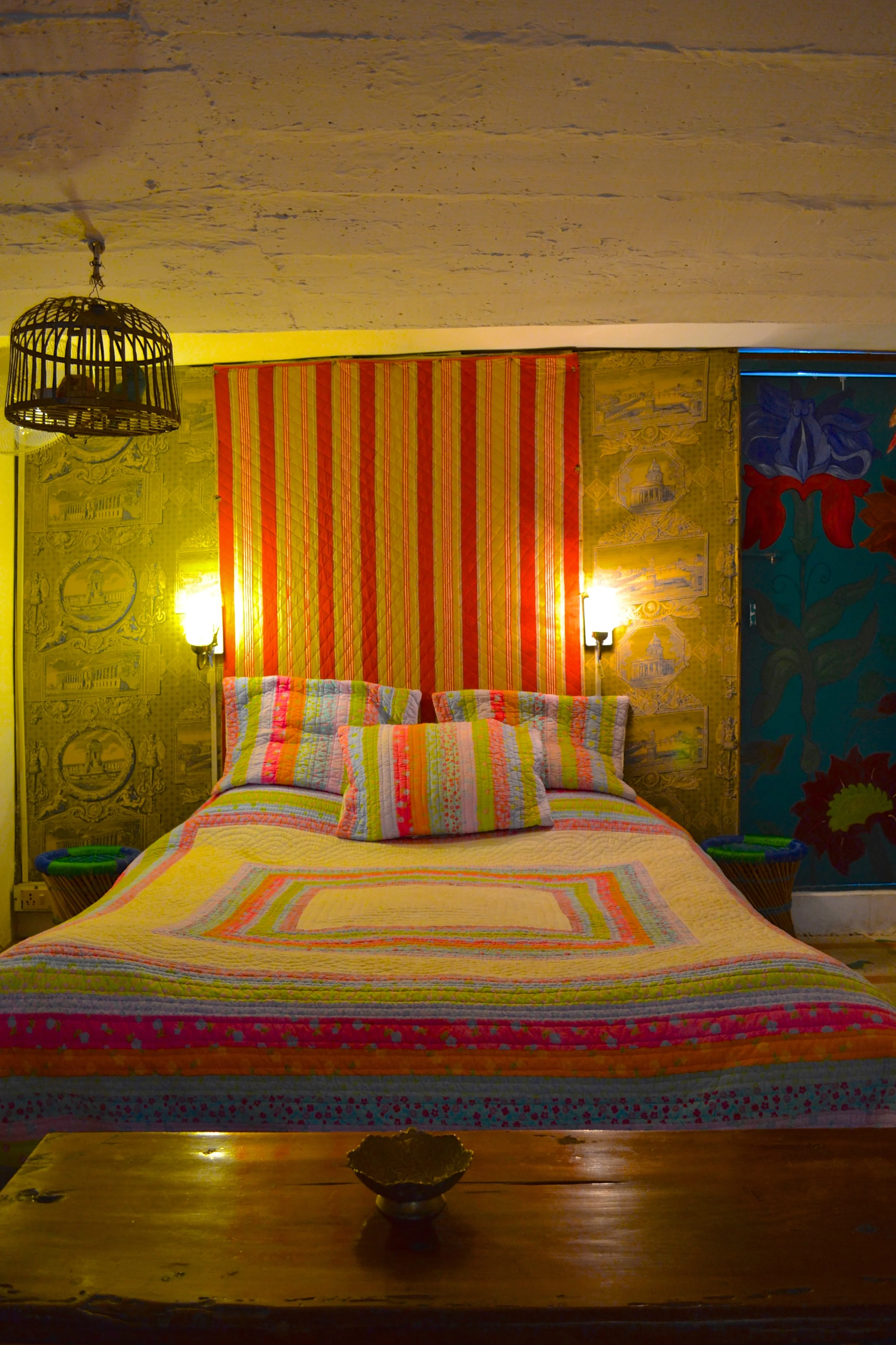 Each of the five bedrooms has it's own theme - Peela Kamra, Chidiya Kamra, Neela Kamra and others. The walls have been hand painted by Bhuvan's daughter-in-law who lives on the property along with her husband and son. Each and every corner of the house radiates with vibrant and welcoming energy and every room has its own character and charm.