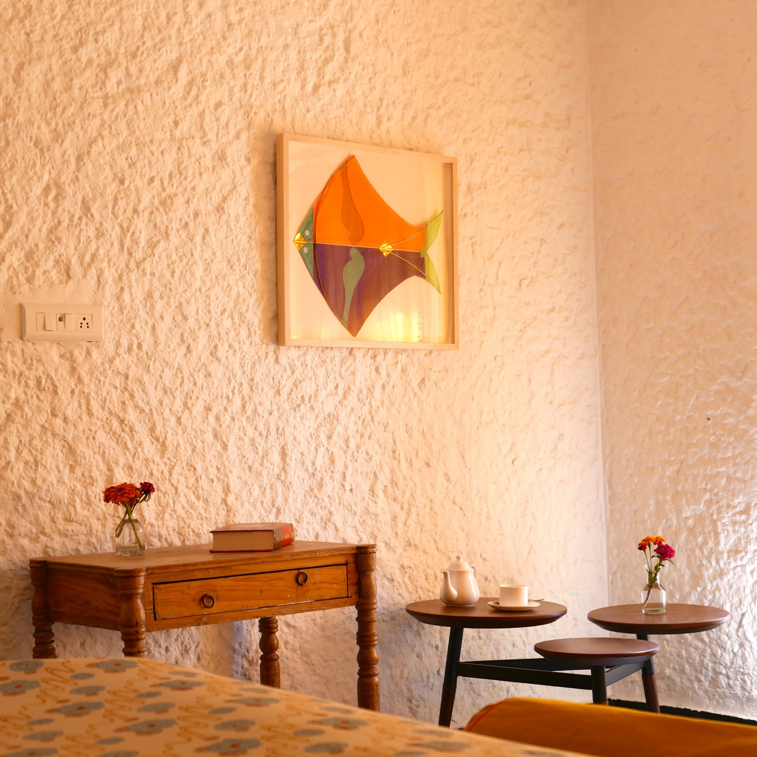 Be prepared to be mesmerized by the enchanting rooms at the retreat. The wooden ceilings, white walls and black oxide floors fills the space with soothing energy that makes for a relaxing, cozy stay.