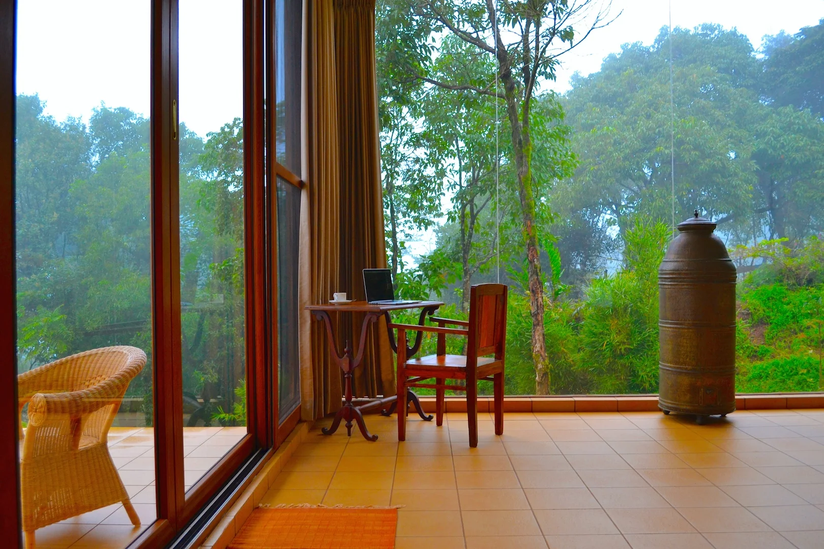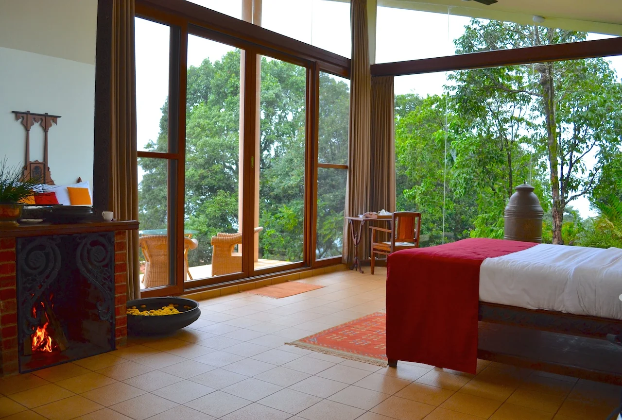 The luxury villas, each with a gorgeous glass room, a beautiful bathroom with a bathtub, a sit-out and a warm fireplace, offer stunning views of the western ghats.